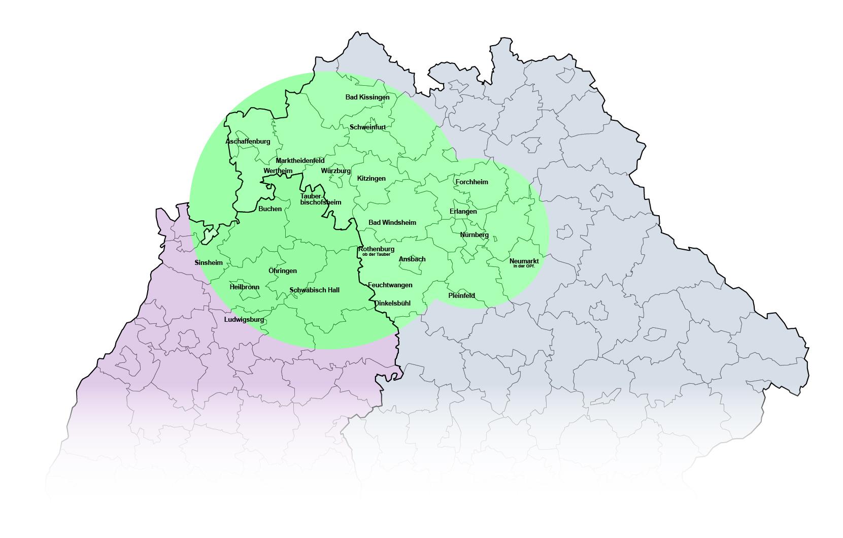(Rothenburg ob der Tauber, Ansbach, Feuchtwangen, Dinkelsbühl, Schweinfurt, Aschaffenburg, Tauberbischofsheim, Nürnberg, Würzburg, Bad Kissingen)